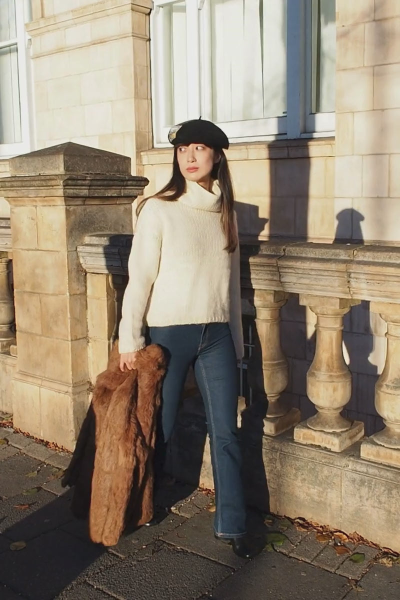 ナチュラルな色のウールの太糸で編まれた厚手のニットで、大きく立ち上がったハイネック部分は、まるで羊そのものになった気分になるほど暖かく包んでくれます。